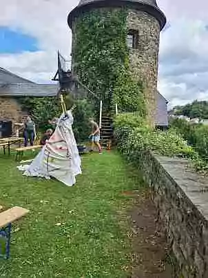 Nachdem die Cowboyhüte und der Federschmuck fertig waren, fehlte als Erstes natürlich eine Unterkunft für die erfinderischen Kinder. Die einen sammelten in ganz Olpe große Kartons, um einen Saloon zu bauen, die anderen bemalten Laken, um hinterher zwei Indianertipis aufzustellen. Die neu errichtete Wild-West-Kulisse wurde von den fleißigen Erbauern bei einem anschließenden Lagerfeuer mit Stockbrot und Feuerwasser eingeweiht.