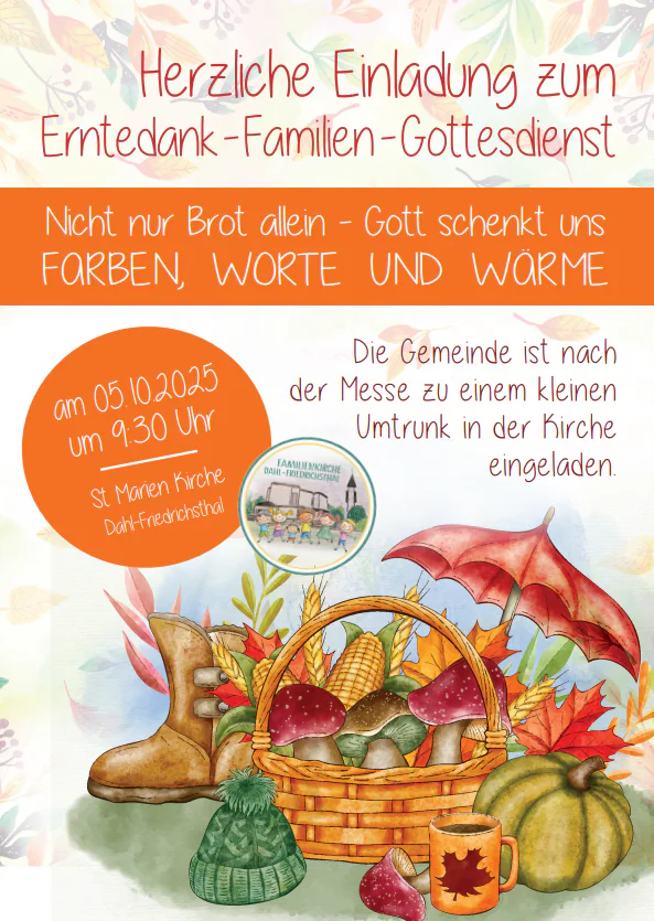 09:30 | Familiengottesdienst + Zu Google Kalender hinzufügen + iCal / Outlook exportieren Datum 05. Okt. 2025 Abgelaufen! Uhrzeit 9:30 Kategorien Familiengottesdienst Ort St. Marien Kirche Dahl Marienweg 3, 57462 Olpe Gemeinden St. Marien Dahl-Friedrichsthal