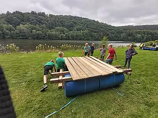 Dazu konnten sich die Gruppen ‚Clownfische‘, ‚Profi Paddler‘ und ‚Lahme Esel‘ durch das Gewinnen von Team- und Vertrauensspielen weitere Materialien für den Flossbau verdienen. Mit Schwimmwesten, Paddeln und guter Laune ging es dann nach dreistündigem Werken auf den Biggesee zum Testen der selbstgebauten Flösse. Alle Flösse hielten dabei stand und schafften es auch sicher wieder ans Ufer.