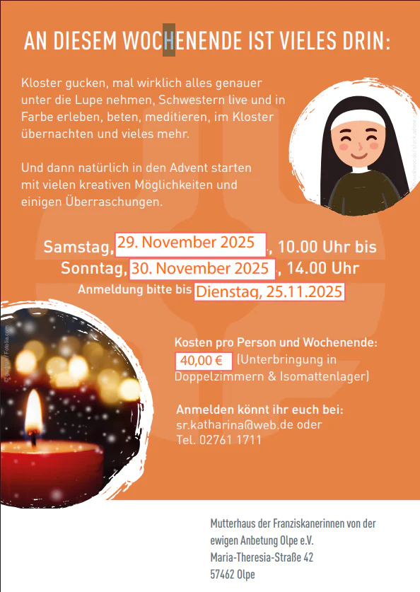 Wieder laden die Olper Franziskanerinnen zu einem Mädchenwochenende ins Mutterhaus ein. Es findet am ersten Adventswochenende statt und beginnt am Samstag 29. November um 10.00 Uhr und endet am Sonntag 30. November um 14.00 Uhr. Mädchen zwischen 12 und 16 Jahren sind ganz herzlich eingeladen. Es geht um Kloster gucken, mal alles genauer unter die Lupe nehmen, Schwestern live und in Farbe erleben, beten und singen, im Kloster übernachten. Und dann natürlich in den Advent starten und mit kreativem Gestalten und Basteln einen tollen Abend verbringen. Übernachtung ist in Doppelzimmern und auf Isomattenlager möglich. Anmeldungen bis 25. November bei sr.katharina@web.de oder telefonisch unter 02761/ 1711 im Konvent San Damiano.