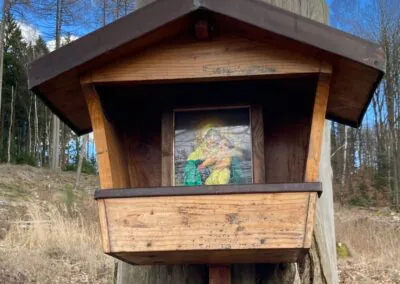 Der bedachte Bilderrahmen wurde von Schreinermeister Franz Josef Schneider aus Rhode erneuert und für das inzwischen schadhafte Bild stiftete das Pallottihaus ein neues. Die Bildeinfassung stiftete Buchbindermeister K. H. Pape aus Olpe. Ein Natur- und Heimatfreund unterstützte mit finanziellen Mitteln diese Restauration.