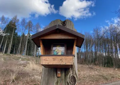 Da wiederum das Holz faul wurde und das Bild schimmelte, organisierte Ortsvorsteher Abel eine Kompletterneuerung. In Sven Wacker konnte ein kundiger Handwerker gefunden werden, der 2013 mit Beteiligung seines Vaters Hans Joachim (Achim), ein neues Häuschen für ein neues Bild baute. In Zeiten von Internet wurde dieses sozusagen “Original-Bild” von Anton Immekus heruntergeladen, in bester Fotoqualität ausgedruckt, zusätzlich laminiert und von Achim Wacker “wasserdicht” eingerahmt und eingebaut.