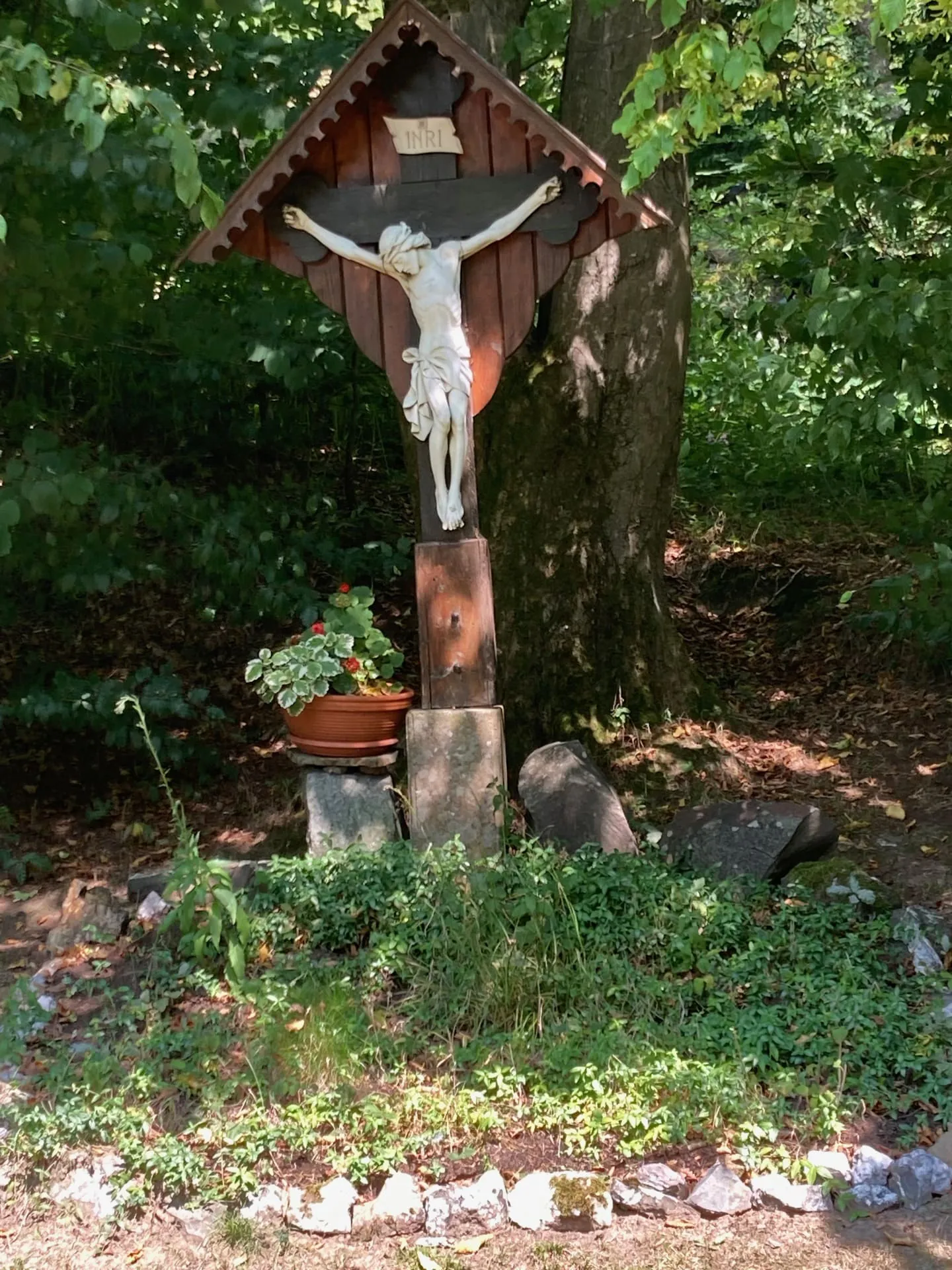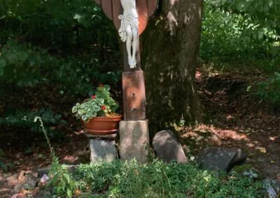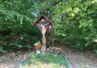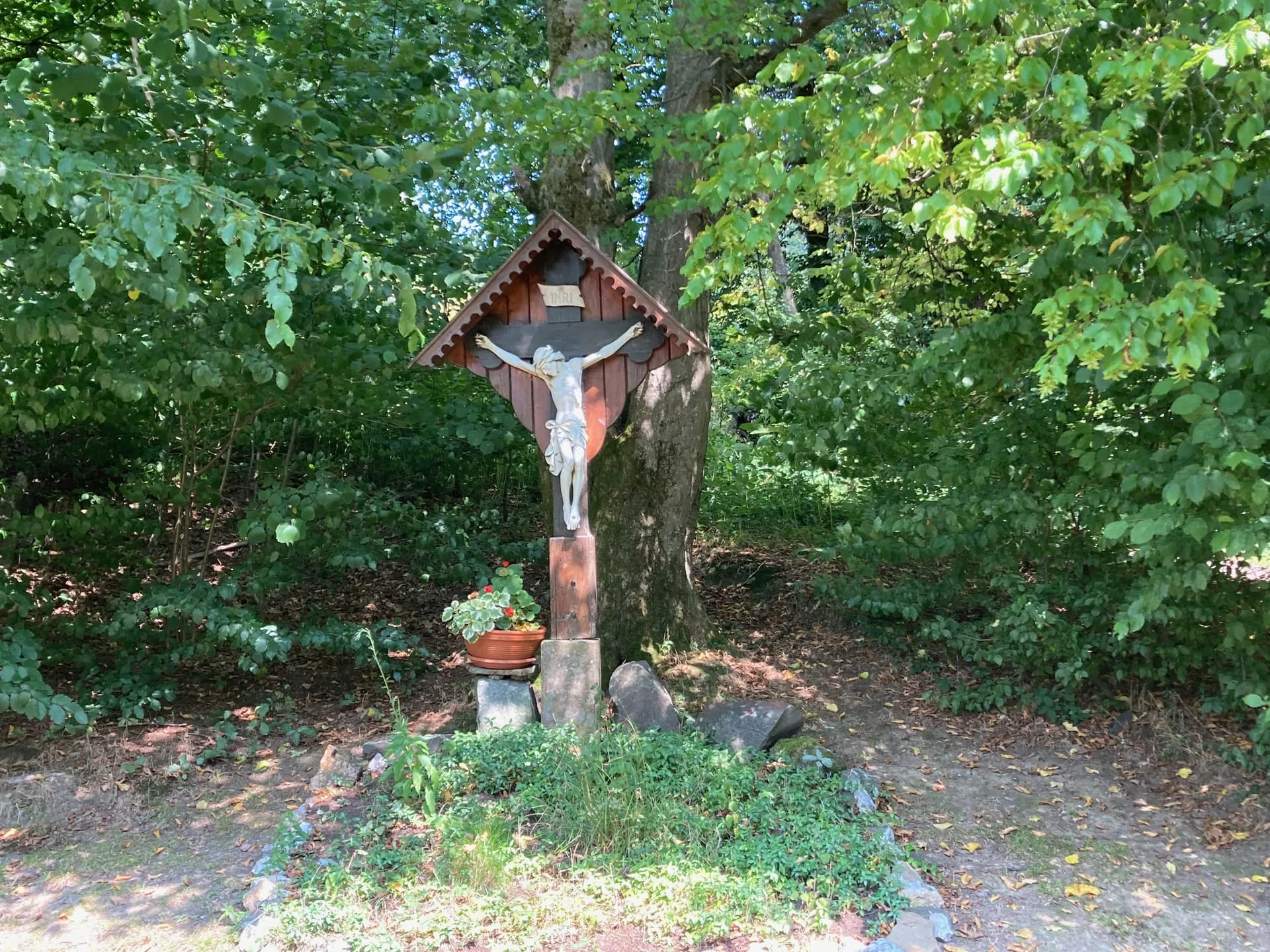 Geht man den Weg Zur Kill­mecke in Rehring­hausen entlang und dann den steilen Berg hinauf, dann geht oben ein Weg nach links ab. Direkt dort steht ein Kreuz mit weißem Korpus. Das Kreuz hat eine Rück­wand aus Holz und ein Spitz­dach. Das Dach hat ein kunst­voll gestal­tetes Brett an der Schräg­seite. Ein kleines Beet befindet sich vor dem Kreuz, das mit kleinen Bruch­steinen abge­grenzt ist.