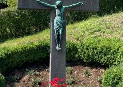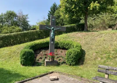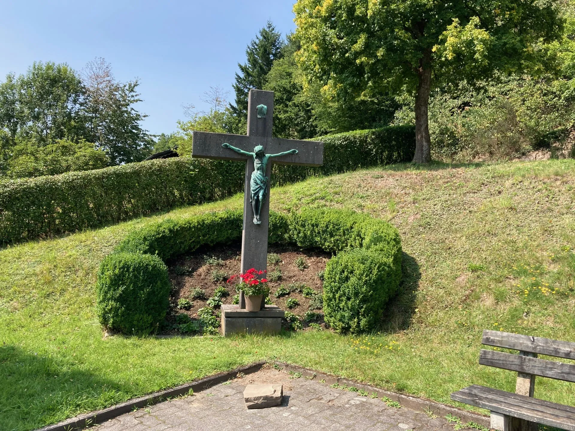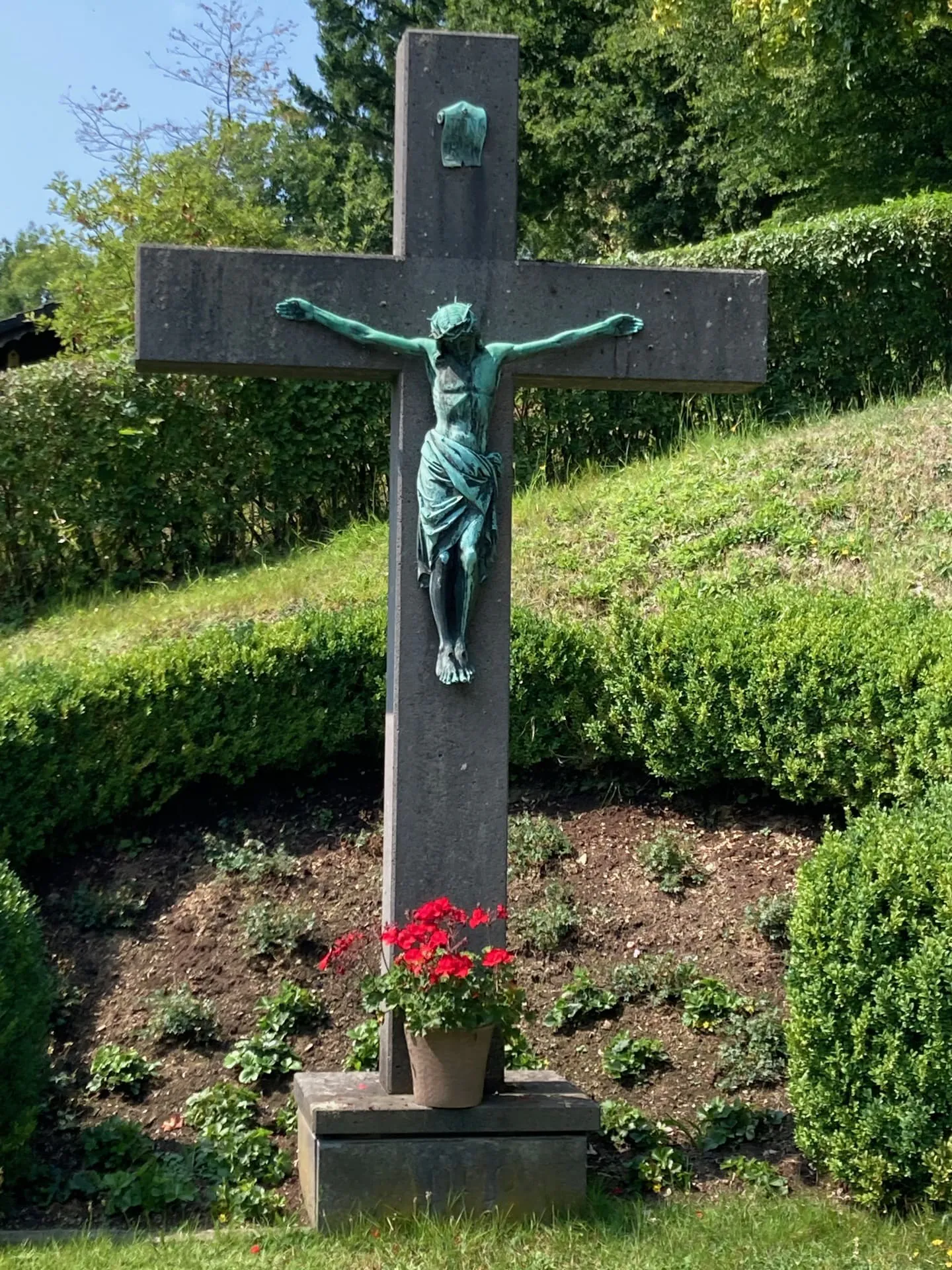 Vor der Rehringhauser Kirche St. Nikolaus steht ein großes Steinkreuz mit Korpus. Der Korpus ist aus Kupfer und mit grüner Patina überzogen. Das Kreuz steht auf der Wiese. Hinter dem Kreuz befindet sich eine Buchsbaumhecke und ein kleines Beet.