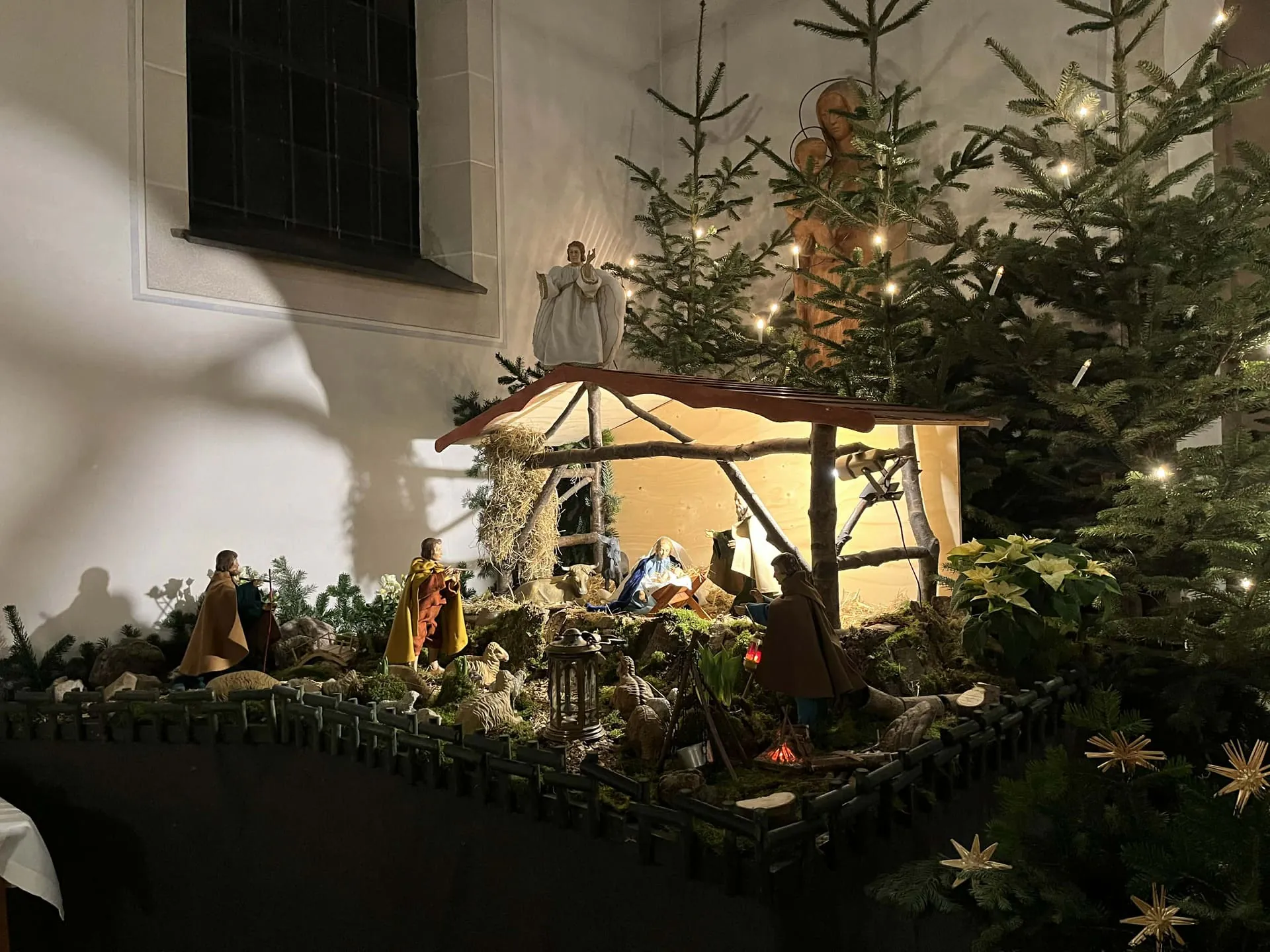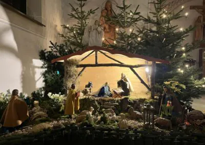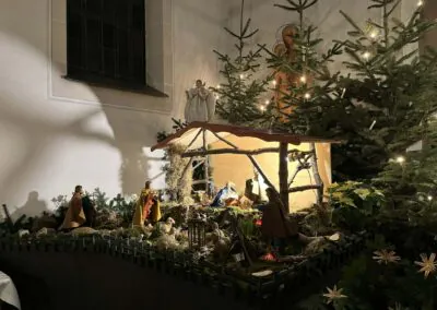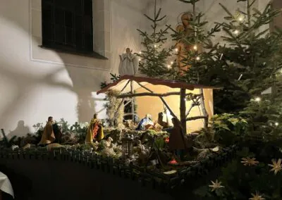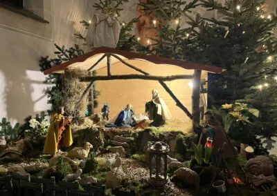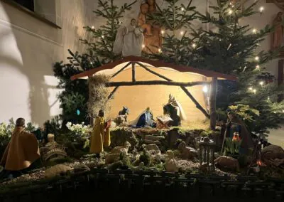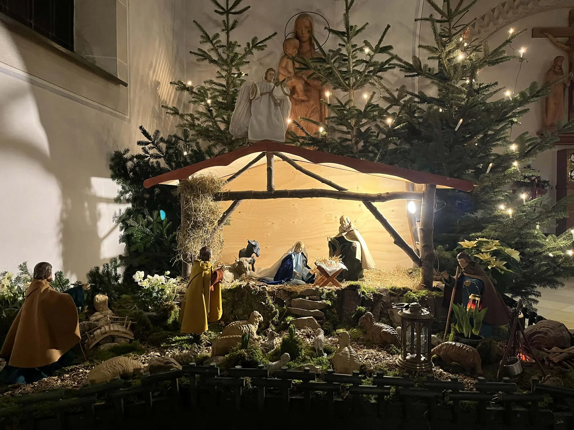 In der Kirche St. Josef in Bleche steht eine Krippe mit einem beleuchteten Holzstall. Die Krippenfiguren sind aus Holz und mit Kleidungsstücken angezogen. Verschiedene Pflanzen, Moos, Stuken und eine Brücke verschönern die Krippe. Ein Hirte hat sogar eine leuchtende Lampe in der Hand. Der Stall ist mit Stroh ausgelegt. Der Stall steht etwas erhöht. Eine Treppe mit drei Steinstufen führt hinauf.