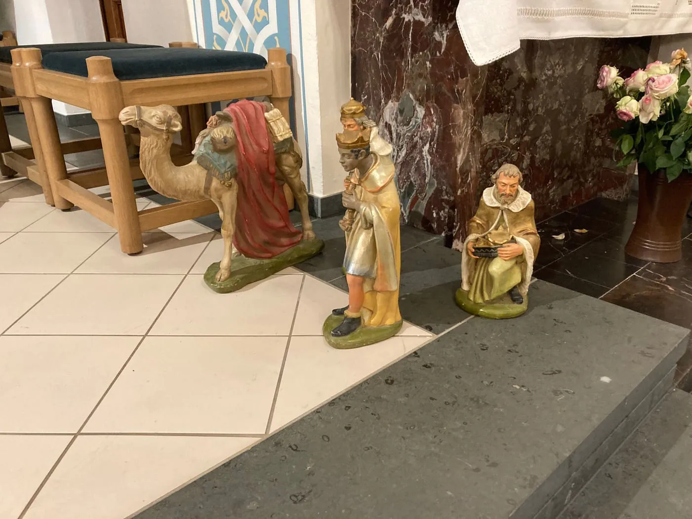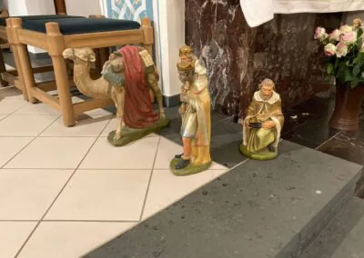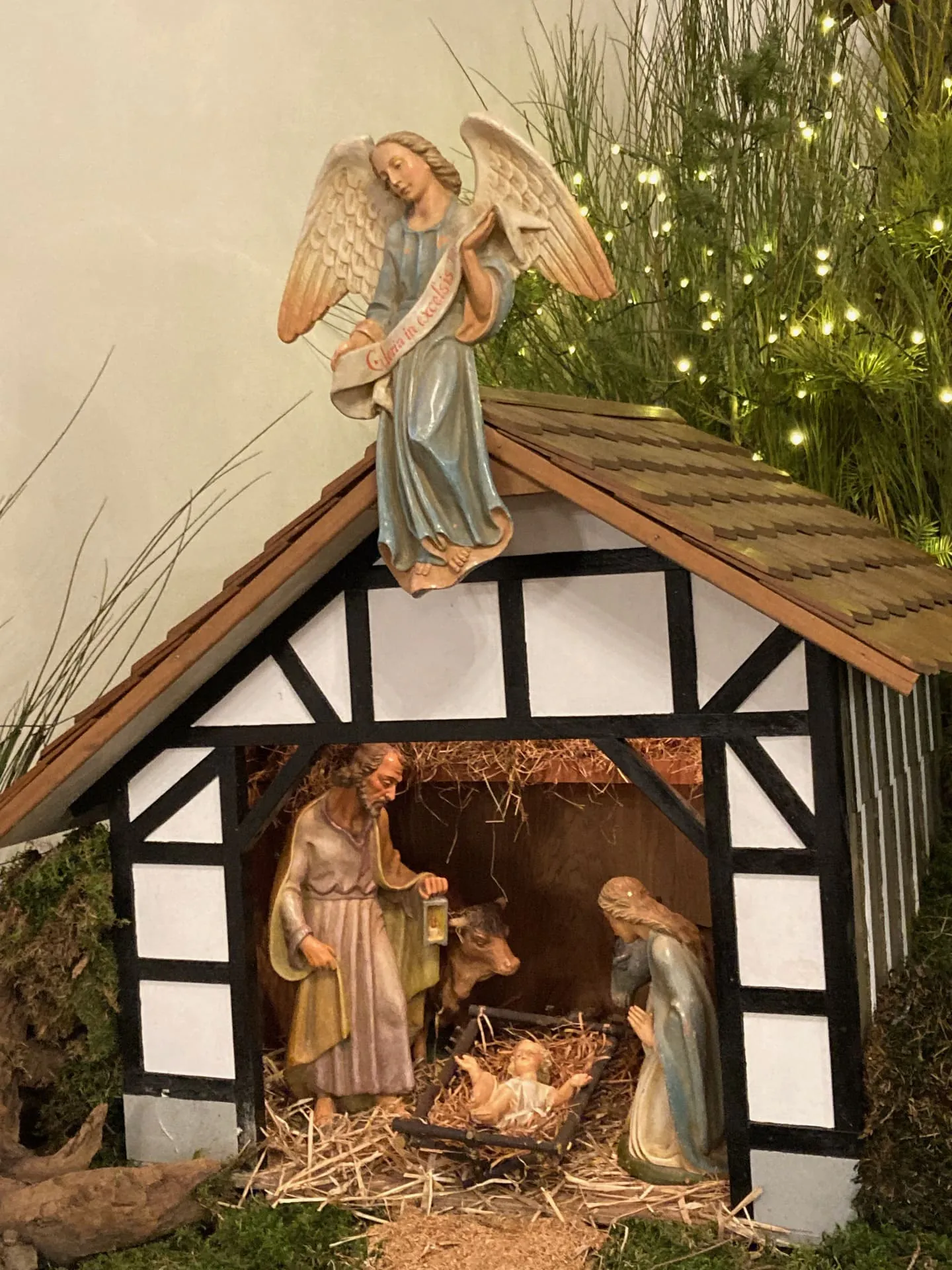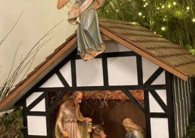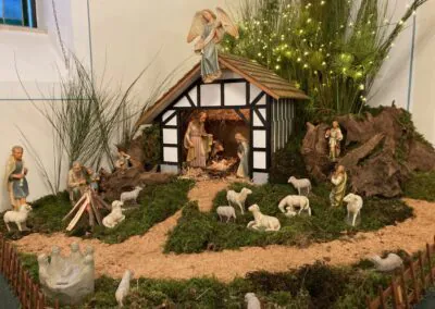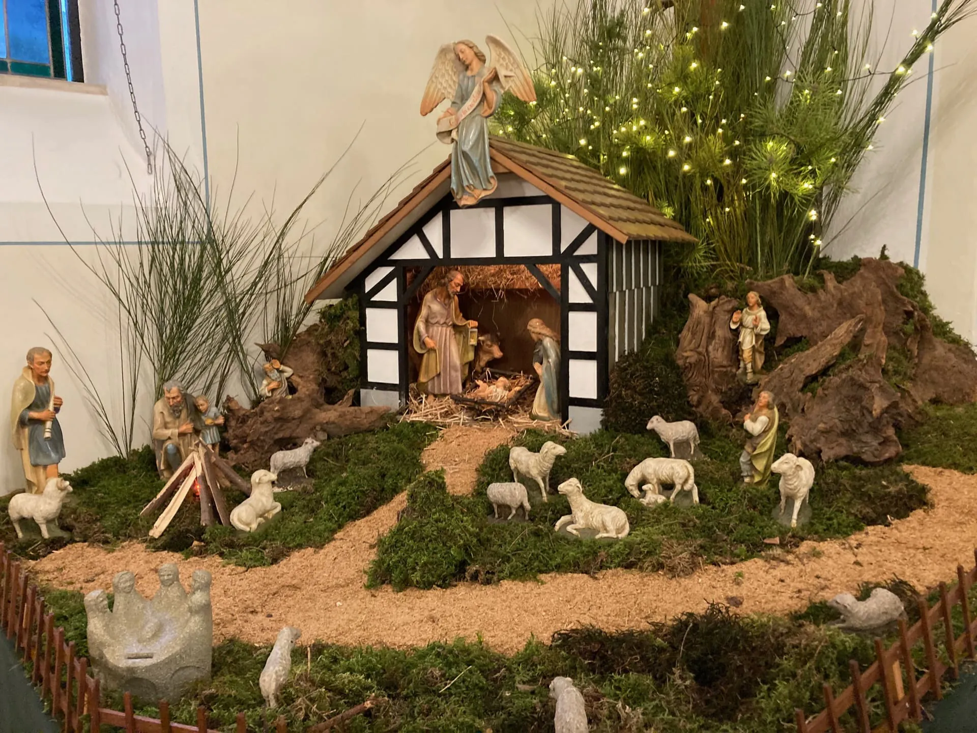 In St. Laurentius Schreibershof steht am Altar eine Krippe mit einem Fachwerkstall. Der Stall ist von innen beleuchtet und ist aus Holz gefertigt. Die Schafe liegen und stehen auf Moos. ein Weg führt zur Krippe hin. Stuken und Ginster bilden den Abschluss nach hinten.