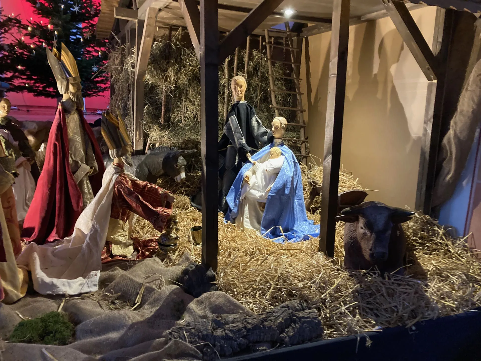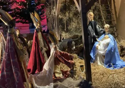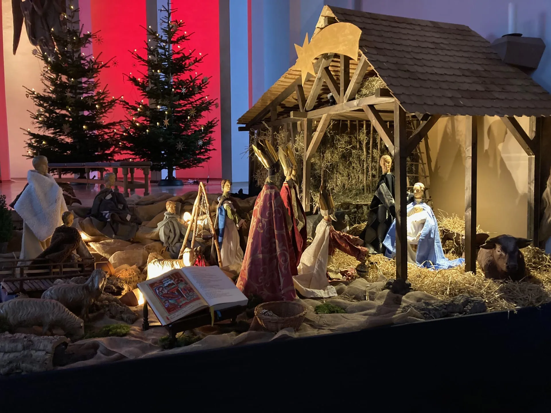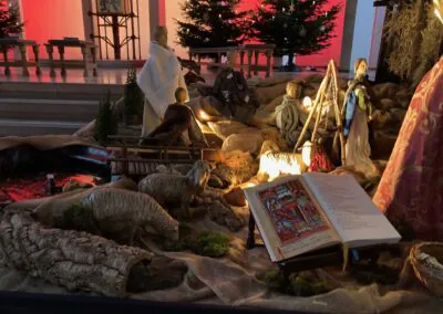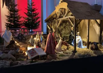 Die Krippe steht schon zum Beginn der Adventszeit. Es werden dann verschiedene Szenen passend zum Evangelium des Sonntags dargestellt. Aufgebaut wird sie vom Küsterteam und freundlichen Helfern.