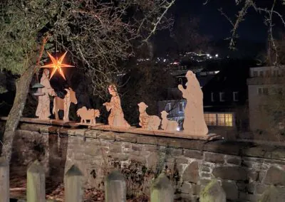 Hoch oben auf der Olper Stadtmauer haben die Schwestern der Olper Franziskanerinnen, die im Konvent San Damiano leben, eine Krippe aufgebaut. Die Krippenfiguren sind aus flachen Holzbrettern ausgesägt. Ein orange leuchtender Stern ist Teil der Krippe.