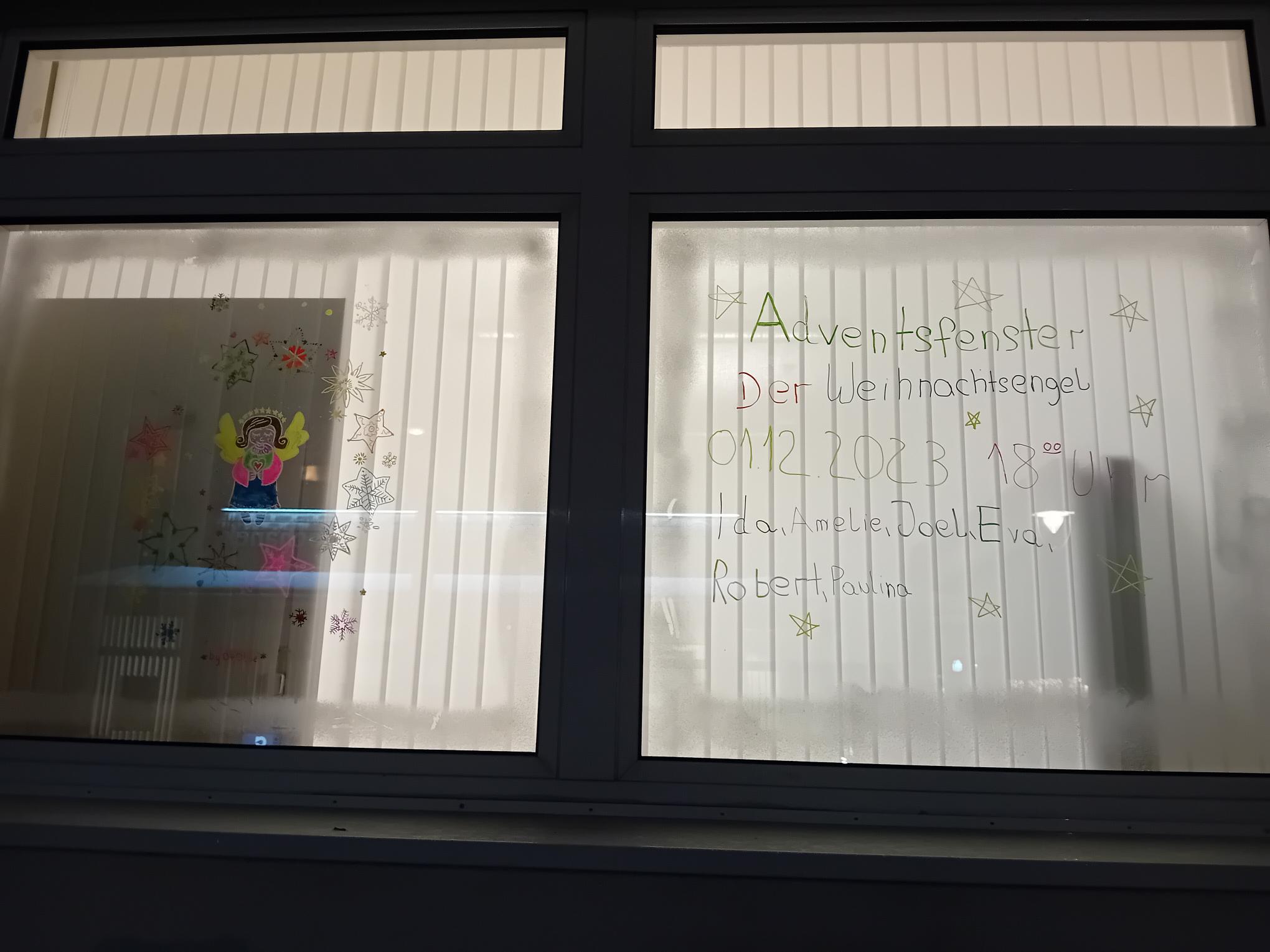 Das Fenster wurde von Besucherkindern der Einrichtung zu der Geschichte „Der Weihnachtsengel“ gestaltet.