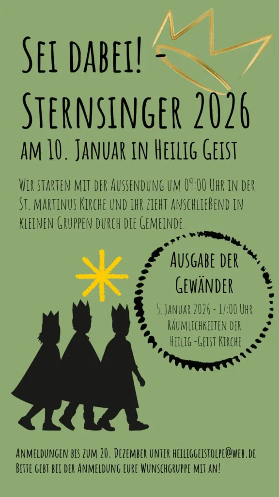 Die Sternsinger aus Hl. Geist werden am 10. Januar durch die Gemeinde ziehen. Der feierliche Sternsinger-Gottesdienst findet am Sonntag, den 11. Januar um 11.00 Uhr in der Heilig-Geist Kirche statt.