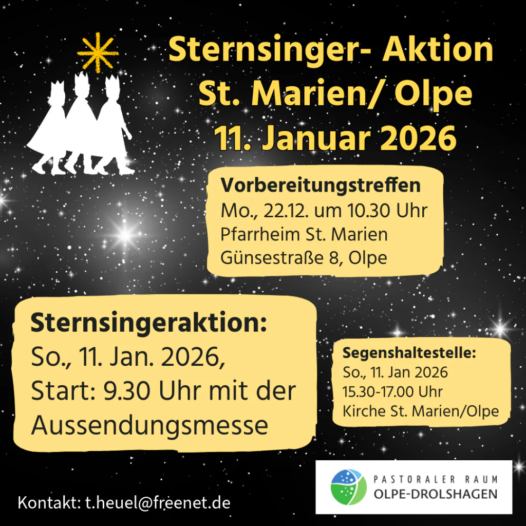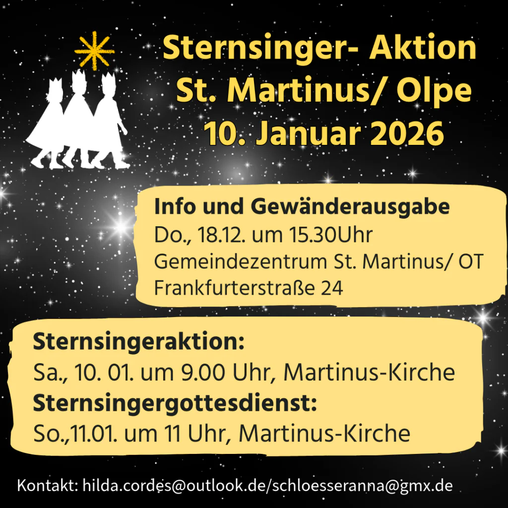 Der Wortgottesdienst mit Aussendung der Sternsinger für Sondern, Eichhagen und Stade findet am Sonntag, 04.01.2026 um 11:00 Uhr statt.