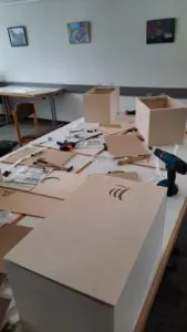 Auch Martin Berens, freiberuflicher Tontechniker und Musiker aus Welschen-Ennest, war zum ersten, aber bestimmt nicht zum letzten Mal im Lorenz-Jaeger-Haus. Im Rahmen des Kulturrucksack NRW hatte er professionelle Cajón-Bausätze für die angemeldeten Jungs mitgebracht. Ein Cajón, auf Deutsch auch Kistentrommel, ist ein aus Peru und Kuba stammendes Perkussionsinstrument mit trommelähnlichem Klang, auf dem man während des Spielens sitzt. Am Vormittag bastelten die Teilnehmer zunächst gemeinschaftlich ihre neuen Schlaginstrumente zusammen, wobei sie zugleich auch Informationen zur Geschichte der traditionellen Trommeln erlangten.